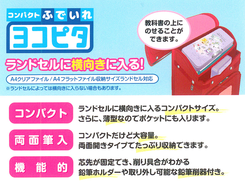 荷物が多くても安心。水彩タッチの優しい色合い「サンリオキャラクターズ」のコンパクトな筆入れが登場。通常の筆入れより約25%も小さいのでランドセルの空いたスペースを有効に活用できます。コンパクトながら、週能力は抜群。鉛筆6本、ケシゴム、名前ペン、15cm定規、分度器、三角定規など小学生に必要な文具もキチンと入ります。