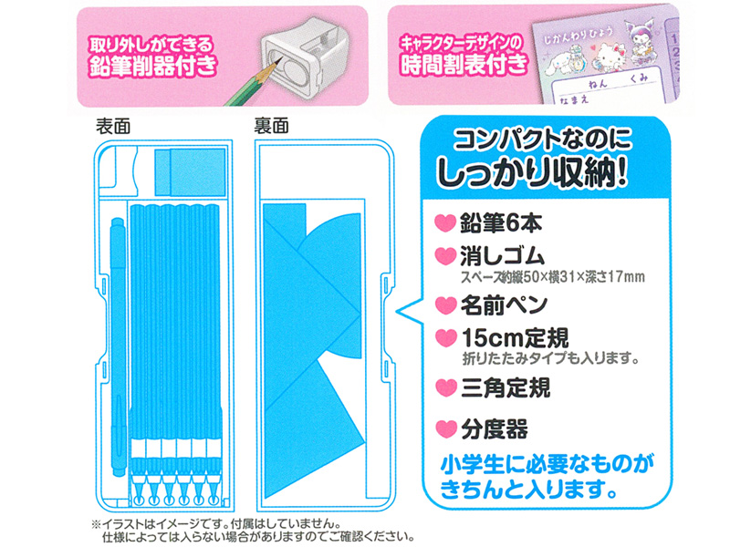 - セット内容:両開き筆入れ×1 時間割表×1・ミニ鉛筆削り×1