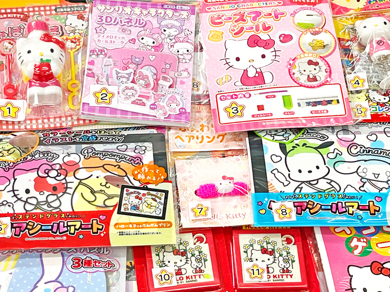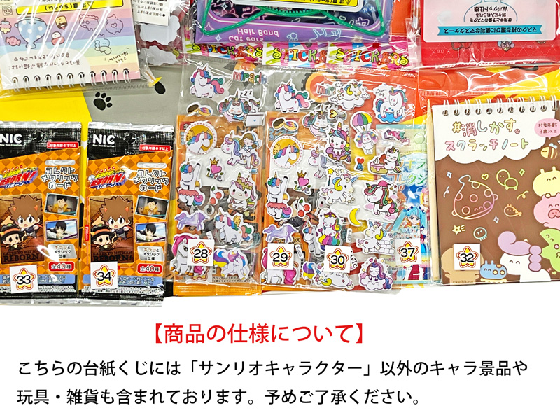 くじを引いて引いた番号の景品がもらえる台紙くじです。景品は40付き。当たりのメイン景品は【サンリオキャラクター】の商品ですが、ハズレや当たりの一部には関係のない景品も含まれます。