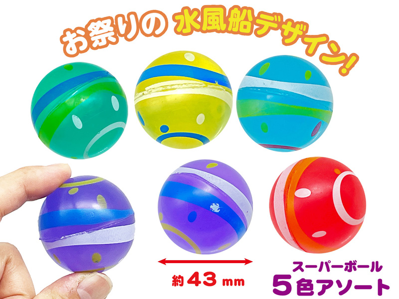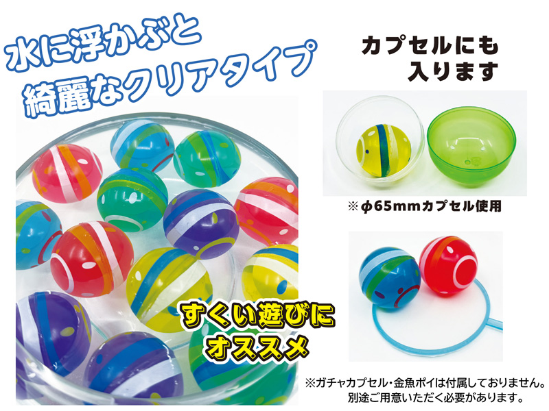 ヨーヨー釣りの水風船のような柄のスーパーボールが登場です。ボールサイズは、カプセル景品にも最適な約43mm。水に浮かぶと綺麗なクリアタイプ♪まさに縁日・お祭り向けのすくい景品にピッタリな玩具ではないでしょうか♪