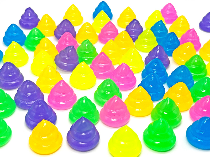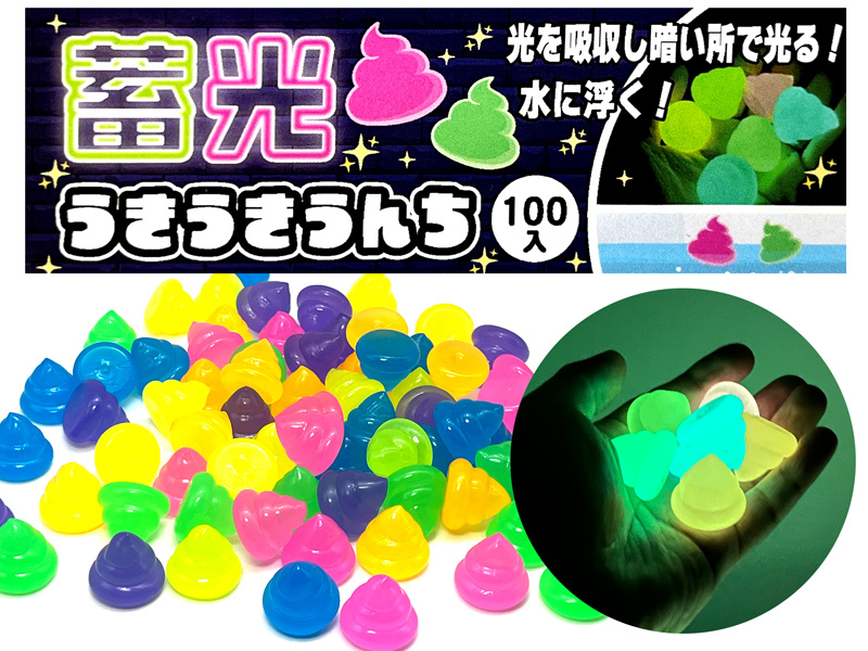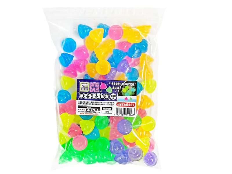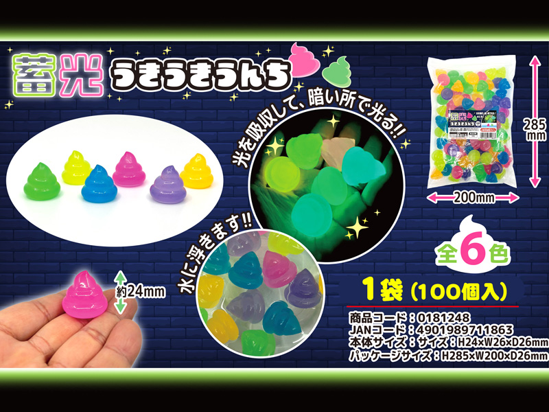 子ども達の大好きな「うんこ」モチーフの変形スーパーボールが登場!こちらは蓄光仕様で光を吸収し、暗いところでぼんやり発光します!本体カラーは全6色。お祭り、縁日、イベントのすくい、浮かし景品にオススメです。