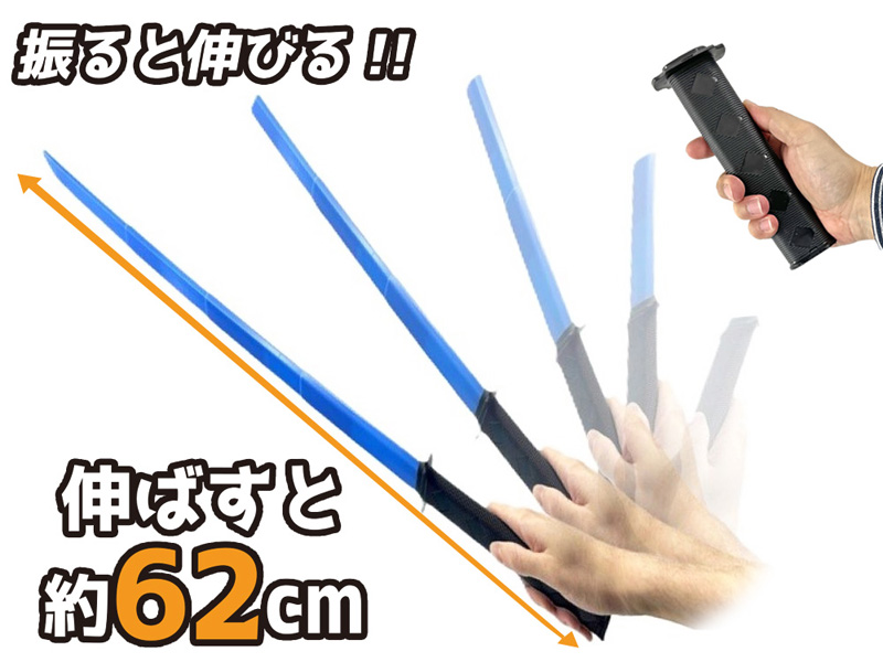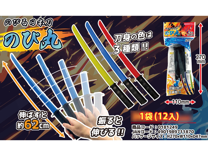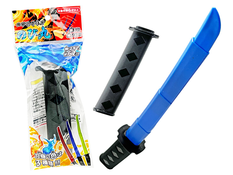 柄を振ると刃がシュシュッと伸びる!伸縮自在の日本刀・のび丸が登場!刀の柄を振ると…スライド式の刃がとびだし最大で約62㎝の長さになります!刀身の色は全3色。各種イベントの男の子向け景品玩具にいかがでしょうか?