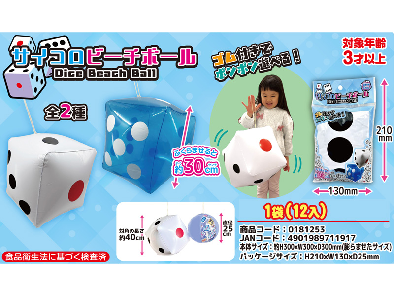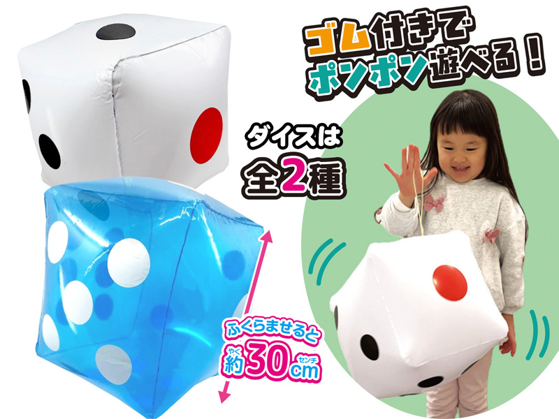 お祭りイベントの人気アイテム!ビニールおもちゃから「サイコロ」型のおもしろビーチボールが登場~♪膨らませると約30㎝の大きさになります。本体カラーは全2色(ホワイト・クリアブルー)展開!糸ゴム付きなので吊り下げて飾ったり、ポンポン弾ませて遊べます。