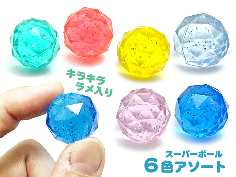 キラキラきれい!ラメ入りのダイヤカットのスーパーボールです♪ボールサイズは約24mm。本体カラーは全6色。縁日・お祭り向けのスーパーボールすくい景品にゼヒ!