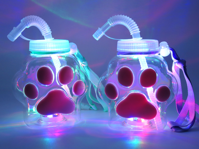 大人気の光るドリンクボトルに肉球モチーフが新登場~♪肉球パーツは適度な弾力性があり、ぷにぷにとした感触が楽しめます。ボトルは底にあるスイッチを押すごとに光り方が3パターンに変わります。首からぶら下げられるストラップ付!夏祭りやイベントで大人気間違いなしです。光るドリンクボトル・飲み物の容器は、品揃え・在庫も豊富な堀商店にお任せください!!