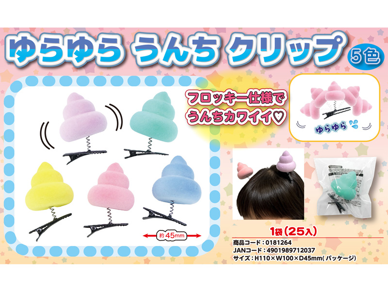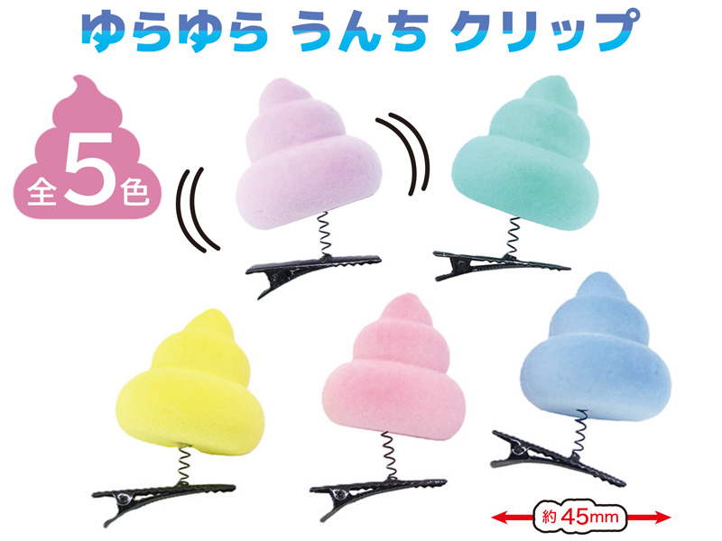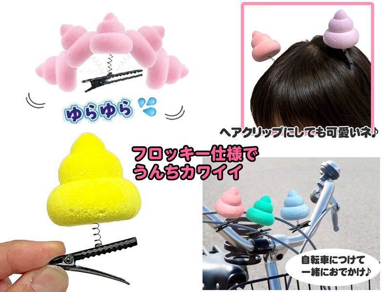 お祭り・イベント界隈で大人気の「ゆらゆらクリップ」シリーズに子どもの大好きな『うんち』モチーフが登場!!うんちマスコットはフロッキー仕様でめちゃカワイイ~♪スプリング付きのクリップは、髪に付けたり、自転車のハンドルに付けたり、色んな活用方法を見つけてみよう。各種イベントの低単価景品・玩具にゼヒ!