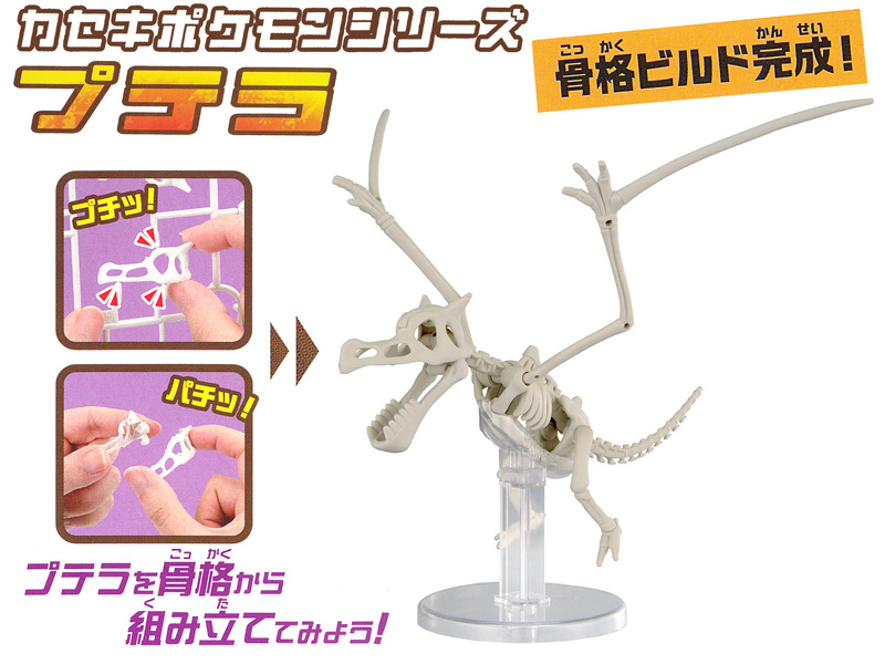 骨格からポケモンを組み立てて遊べる、「ポケプラカセキポケモンシリーズ」が新たに登場!■骨格からポケモンを組み立てる仕様で、プテラについて学びながら作ることができる!■組み立てやすいパーツ構成と色分けを両立!■浮遊状態でディスプレイできる台座が付属しています!