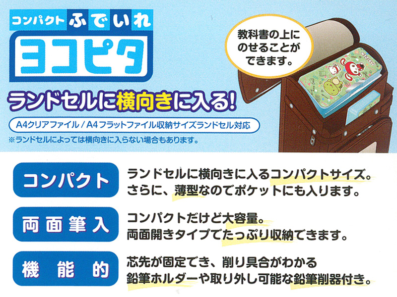 荷物が多くても安心。「まいぜんシスターズ」デザインのコンパクトな筆入れが登場。通常の筆入れより約25%も小さいのでランドセルの空いたスペースを有効に活用できます。コンパクトですが、週能力は抜群。鉛筆6本、ケシゴム、油性名前ペン、15cm定規、分度器、三角定規などコンパクトですがたっぷり入ります。