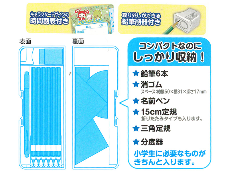 - セット内容:両開き筆入れ×1 時間割表×1・ミニ鉛筆削り×1