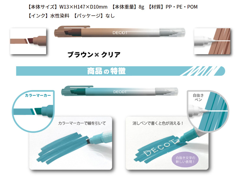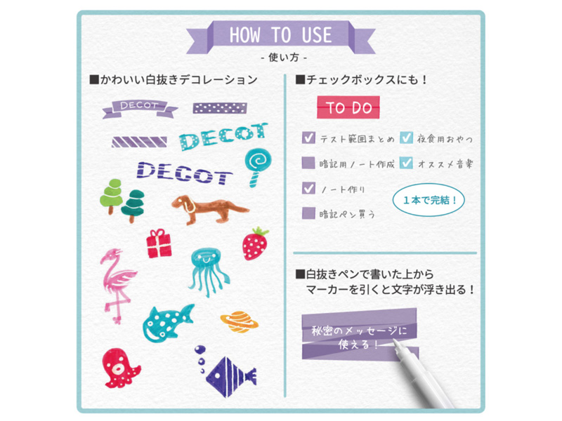 毎日が楽しくなるキュートなステーショナリーシリーズにデコットの白抜きカラーマーカーが登場~♪こちらは特殊なマーカーペンで線を引いて、上から細字消しペンで書き込むとマーカー部分が消えて白抜き文字ができます。かわいい見出しを作ったり、白抜きのかわいいイラストを描いたり…いろんな使い方ができちゃいます♪