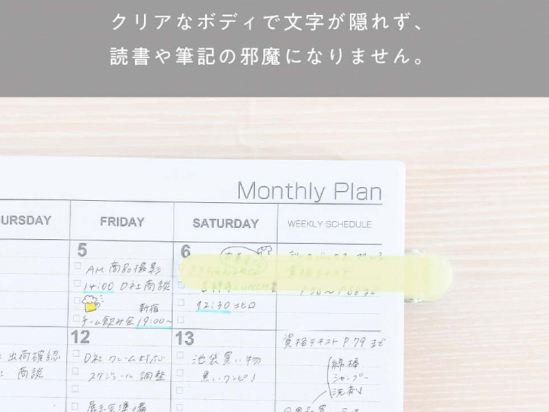 パタパタめくれるクリップ型しおり「シリコンブックマーカー」が登場~。ページをめくっても、しおり部分が自動で追従して開いたページをしっかりキープするので、読みかけのページを見失いません。クリアなボディで文字が隠れず、読書や筆記の邪魔になりません。クリップ型で、表紙に挟んで仕様するので、なくす心配もありません。