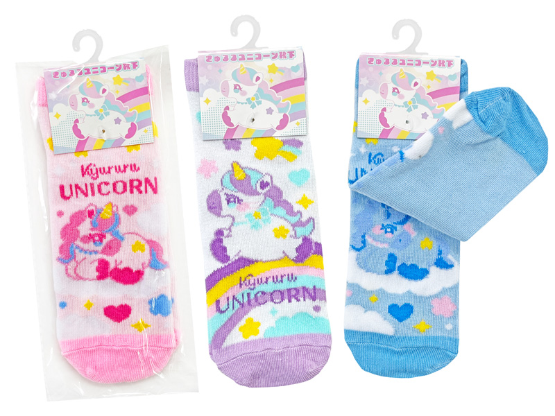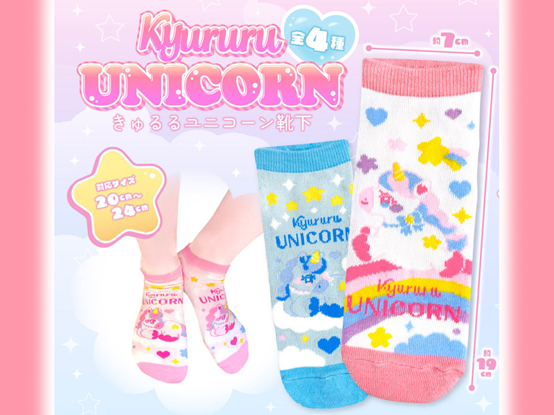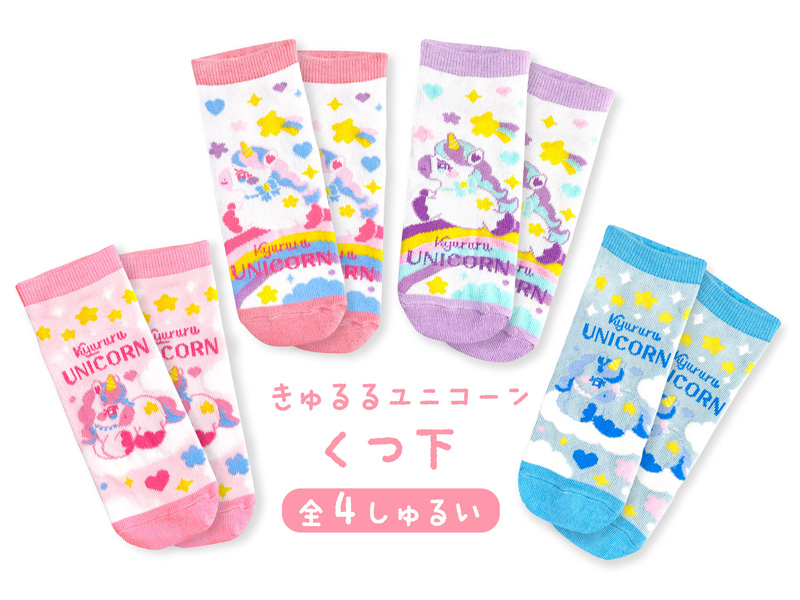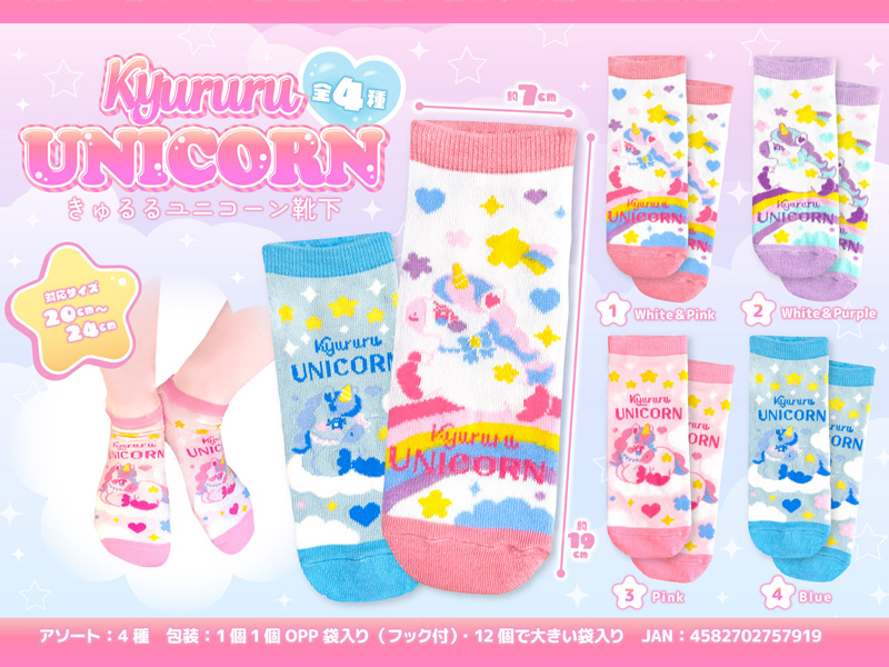 『きゅるるユニコーン』のキュートなキャラクターソックスが登場♪靴下の絵柄は全部で4種類♪対応サイズは20?24cmなのでサイズ合えば、女性の方でもご使用可能。販売用フックが付いておりますので、ディスプレイ用に展示しやすくなっております。