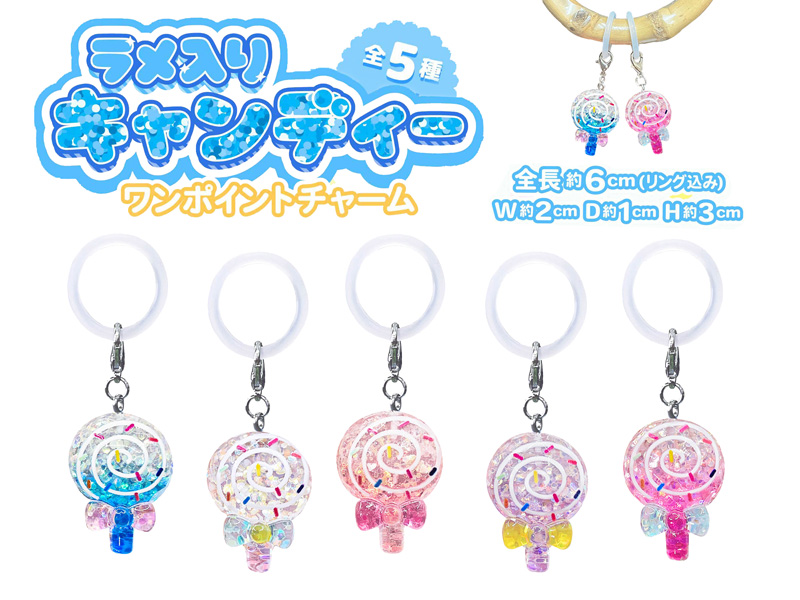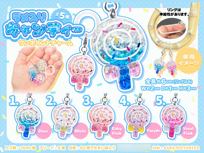 全長約3cm。ラメ入りキャンディーのワンポイントチャームが登場~♪マスコットはキラキララメが入ってとってもキレイ☆彡伸縮性のあるリング付きなので、ペットボトルの飲み口や傘の持ち手など、自分の持ち物のワンポイントとしてもお使いいただけます。イベント向けの低単価景品やガチャガチャ用のカプセルトーイにもオススメですヨ。