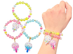 カラフルビーズがとってもカワイイ♪「ラメ入りキャンディーのブレスレット」が登場~♪色とりどりのビーズでつないだブレスレットにはかわいいキャンディのチャームつき♪ブレスのデザインは全5種類。女の子向けの販促景品やカプセルトーイなどにもオススメです♪