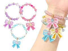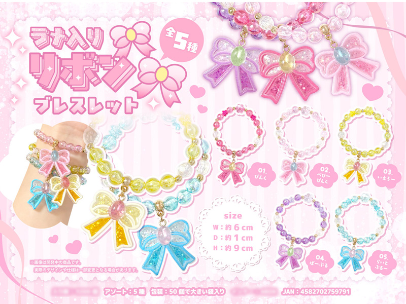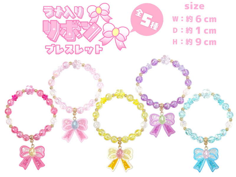 カラフルビーズがとってもカワイイ♪「ラメ入りリボンのブレスレット」が登場~♪色とりどりのビーズでつないだブレスレットにはかわいいリボンのチャームつき♪ブレスのデザインは全5種類。女の子向けの販促景品やカプセルトーイなどにもオススメです♪