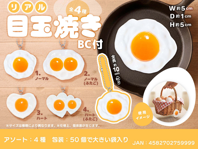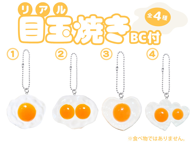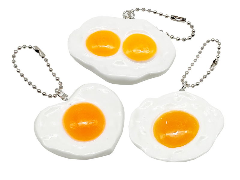 半熟加減がとってもリアルな目玉焼きキーホルダーが登場です。ノーマルタイプからふたご、ハート型までかわいい目玉焼きは全4種アソート。ボールチェーン付きなので、かばんに付けてみんなをびっくりさせましょう。イベント向けの低単価景品やガチャガチャ用のカプセルトーイにもオススメですヨ。