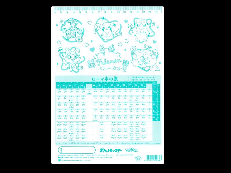 スイート&キュートなデザインが、女の子たちに大人気!「ポケットモンスター・ファンシータイム」のステーショナリーシリーズの2026年版が登場!コチラの下敷きは、地球にやさしい新素材!石灰石から生まれた「LIMEX (ライメックス)」を使用。オモテ面は、キャラクターのイラストが描かれ、ウラ面は、ICT端末でローマ字入力に役立つ表が付いています。