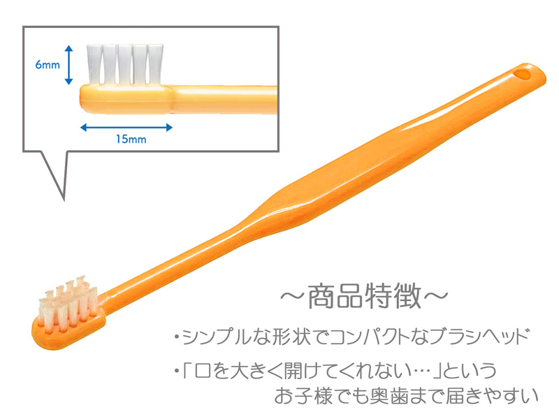 パパとママが磨いてあげる歯ブラシで楽しい歯みがき習慣をつけましょう! リーズナブルさとシンプルさ、コンパクトさを追求した”『0~2才向け仕上げ歯ブラシ』です。商品の特徴…シンプルな形状でコンパクトなブラシヘッド ・「口を大きく開けてくれない…」というお子様でも奥歯まで届きやすい。・細いネックで歯と歯ぐきにやさしいソフト毛・歯ブラシが1本1本個包装なのでご家族での旅行や帰省などのお出かけに持って行きやすいです。