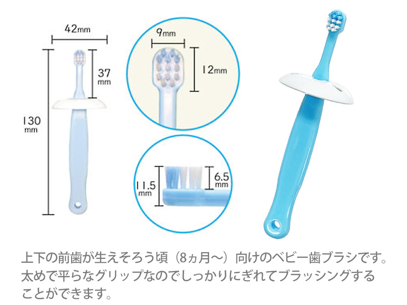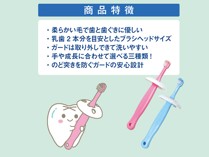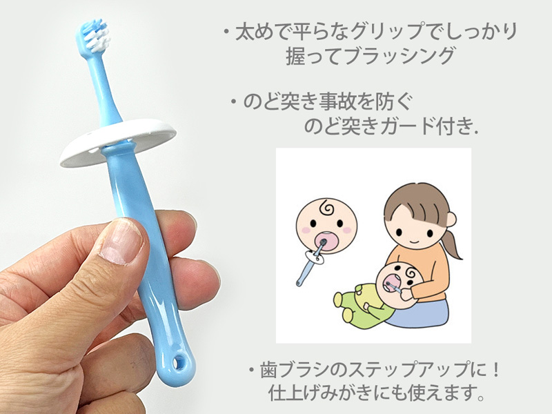 じぶんで歯みがき ⇒ 仕上げもできる2WAY歯ブラシ!上下の前歯が生えそろう頃(8ヵ月~)からのベビー歯ブラシです。太めで平らなグリップなのでしっかりにぎれてブラッシングすることができます。まっすぐなグリップが、お子様の歯みがき後に保護者が仕上げみがきしやすく、2WAYでご使用いただけます。やわらかい毛で乳歯と歯ぐきを磨くことで「歯みがき嫌い」をなくしましょう♪ 歯磨き中の「のど突き」を防ぐガードもついています。