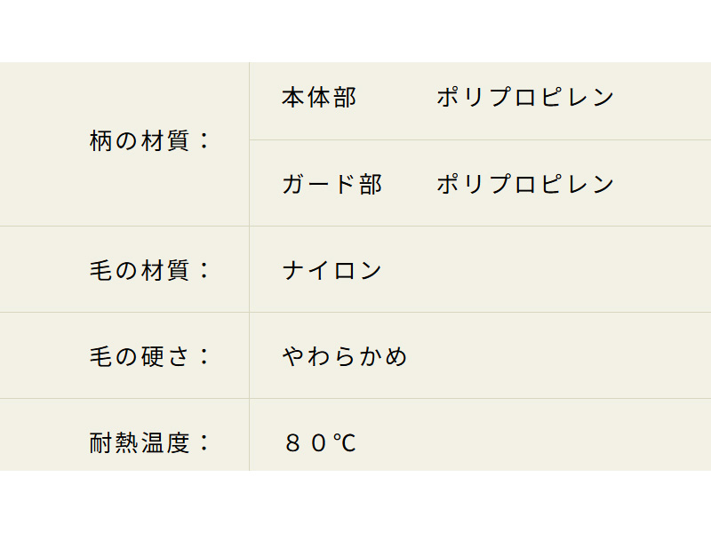 - 柄の材質:(本体部・ガード部)ポリプロピレン / 毛の材質:ナイロン / 毛の硬さ:やわらかめ / 耐熱温度:80℃