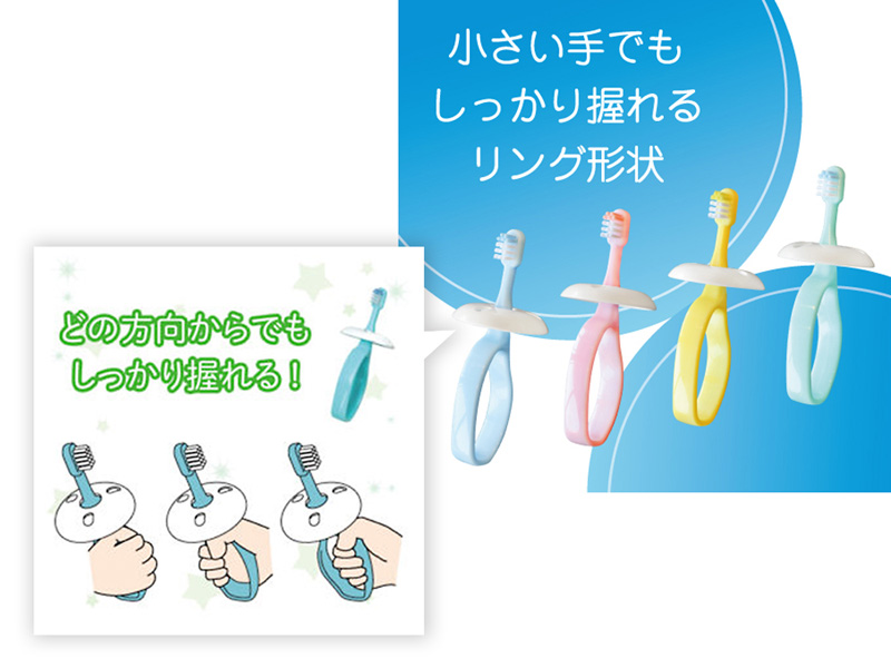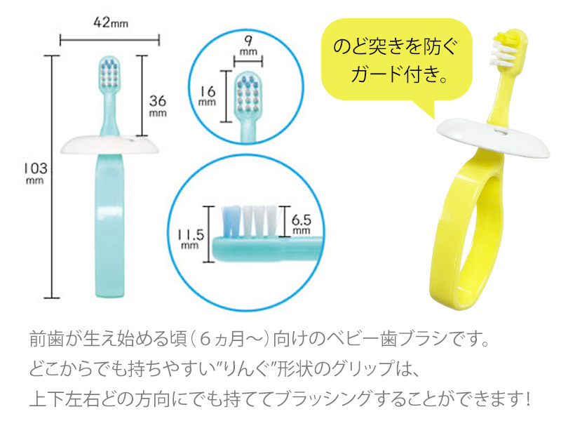 どこからでも持ちやすく、軽いりんぐハンドル!前歯が生え始める頃(6ヵ月~)からのベビー歯ブラシです。どこからでも持ちやすい”りんぐ”形状のグリップは、上下左右どの方向にでも持ててブラッシングすることができます!ブラシヘッドが「乳歯2本分」を目安にしたちょうどいいサイズ感に設計し、やわらかい毛で乳歯と歯ぐきを磨くことで「歯みがき嫌い」をなくしましょう♪ 歯磨き中の「のど突き」を防ぐガードもついています。