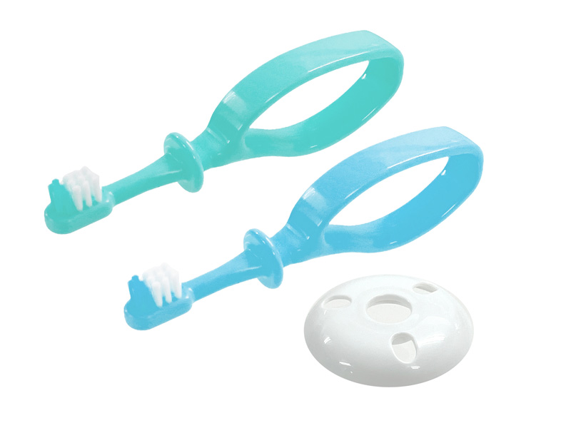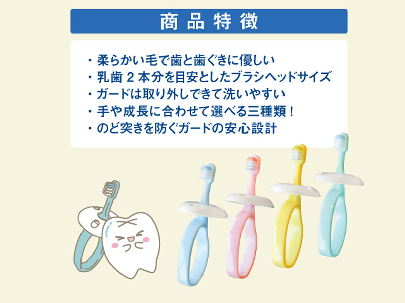 どこからでも持ちやすく、軽いりんぐハンドル!前歯が生え始める頃(6ヵ月~)からのベビー歯ブラシです。どこからでも持ちやすい”りんぐ”形状のグリップは、上下左右どの方向にでも持ててブラッシングすることができます!ブラシヘッドが「乳歯2本分」を目安にしたちょうどいいサイズ感に設計し、やわらかい毛で乳歯と歯ぐきを磨くことで「歯みがき嫌い」をなくしましょう♪ 歯磨き中の「のど突き」を防ぐガードもついています。