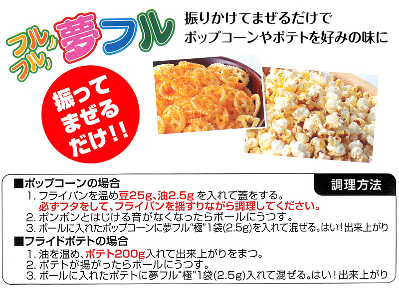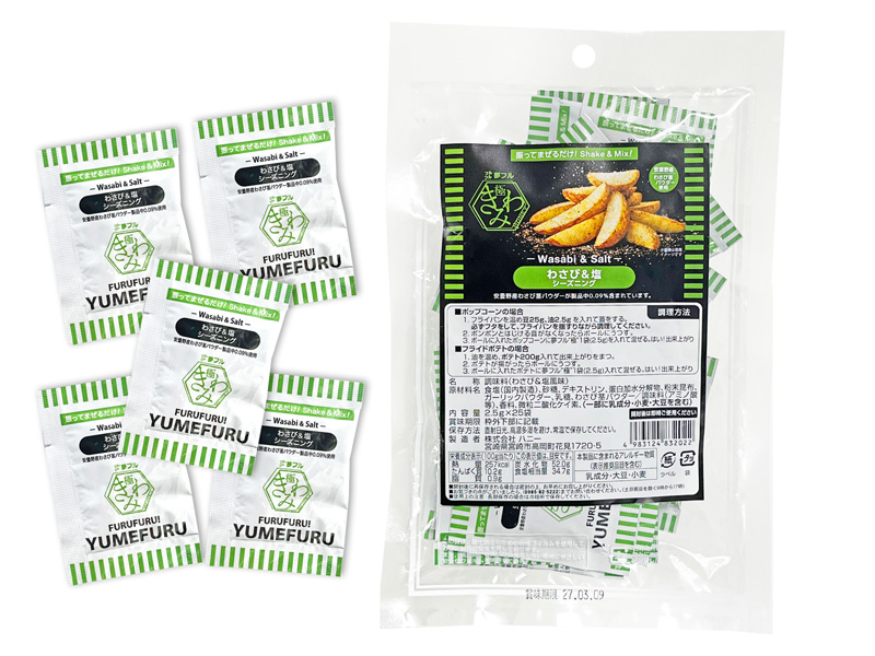 振りかけて混ぜるだけでポップコーンやポテトをお好みの味に仕上げられる!夢フルパウダーにワンランク上の進化系シーズニング【極(きわみ)】が新登場!!お酒にも合わせやすい、大人向けの味わいに仕上げました。こちらのフレーバーはわさび本来の爽やかな香り。塩が引き立てる和のプレミアムフレーバーとなっております。