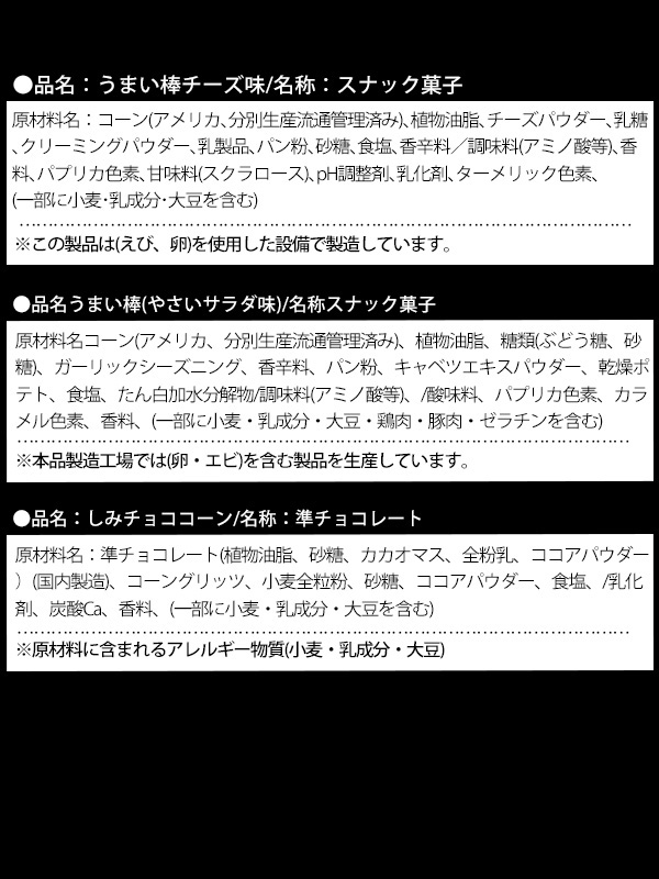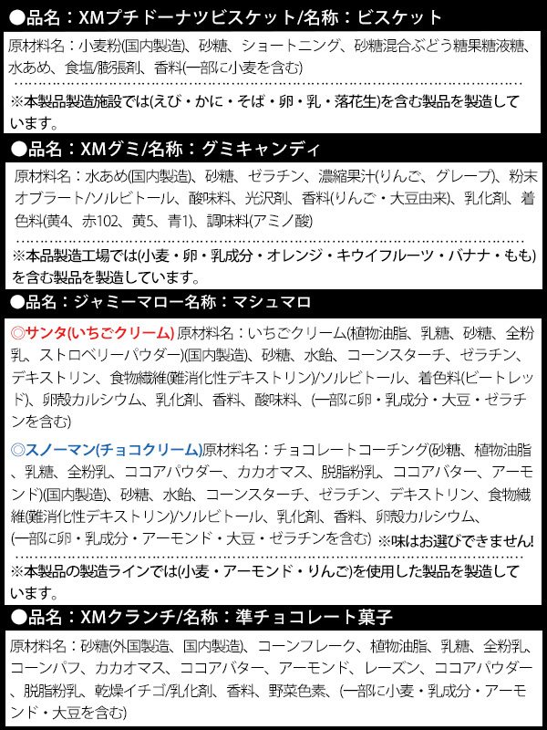 - セット内容…雑貨(XMホビーブロック×1・サンタ人形) お菓子(ブルボンプチ(チョコチップ)×1・クリスマスコーン(ピザ味)×1・キャベツ太郎×1・XMライスボール×1・XMフエラムネ×1・XMプチドーナツビスケット×1・XMグミキャンディ×1・ジャミーマロー(サンタorスノーマン)×1・XMクランチ×1・うまい棒(チーズ)×1・うまい棒(やさいサラダ)×1・しみチョココーン×1)