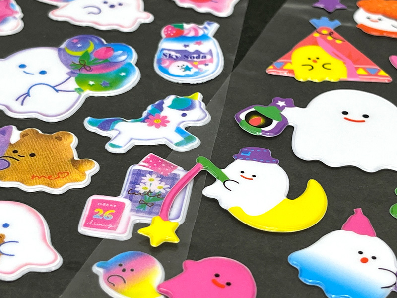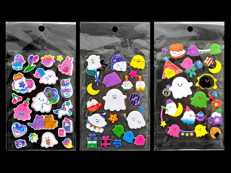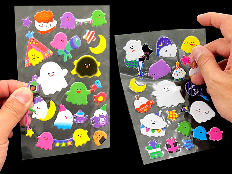 かわいいおばけ達のぷっくりシールが登場~♪こちらは表面がぷっくり膨らんだ半立体のぷっくりシール。1台紙の中にはいろんな表情の可愛いキャラシールが入っています。手帳やノート等いろんなトコロをデコっちゃおう。女の子向けのご褒美景品やプチギフトにもおすすめです!