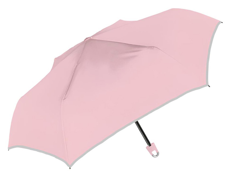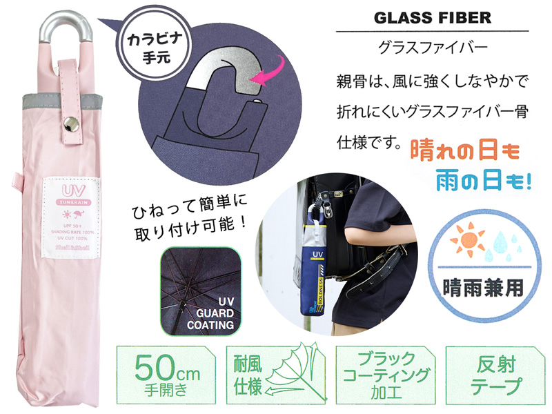 便利な仕様が盛りだくさん!無地のキッズ用折畳み晴雨兼用傘です。持ち手は、カバンやランドセルにも下げられるカラビナ手元仕様。親骨は、風に強くしなやかで折れにくいグラスファイバー骨仕様。傘の表生地には反射テープ、裏生地はブラックコーティングで紫外線をカット!遮熱・遮光効果もあり、晴雨兼用傘としてご利用いただけます