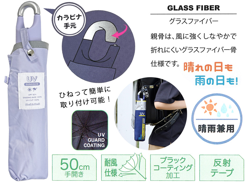 便利な仕様が盛りだくさん!無地のキッズ用折畳み晴雨兼用傘です。持ち手は、カバンやランドセルにも下げられるカラビナ手元仕様。親骨は、風に強くしなやかで折れにくいグラスファイバー骨仕様。傘の表生地には反射テープ、裏生地はブラックコーティングで紫外線をカット!遮熱・遮光効果もあり、晴雨兼用傘としてご利用いただけます