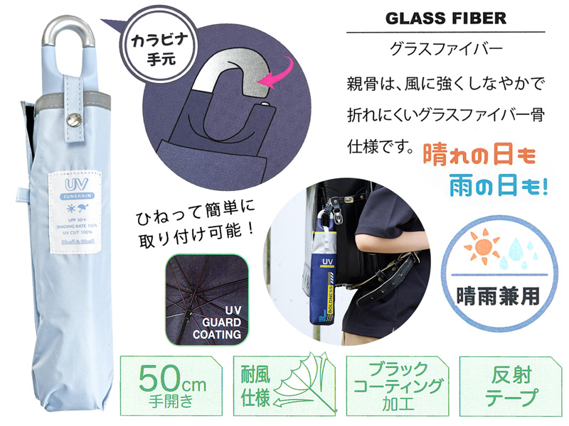 便利な仕様が盛りだくさん!無地のキッズ用折畳み晴雨兼用傘です。持ち手は、カバンやランドセルにも下げられるカラビナ手元仕様。親骨は、風に強くしなやかで折れにくいグラスファイバー骨仕様。傘の表生地には反射テープ、裏生地はブラックコーティングで紫外線をカット!遮熱・遮光効果もあり、晴雨兼用傘としてご利用いただけます