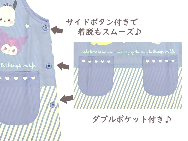 【サンリオキャラ】のお顔をちりばめたかわいいキャラクターエプロンが登場♪エプロン正面には小物がしまえる2つのポケットつき♪左脇がボタンになっているから脱ぎ着もしやすいです。対応サイズは(154~162㎝)なので高学年のお子様もしくは、保育園や幼稚園の先生など大人方へのプレゼントにも喜ばれそうです♪