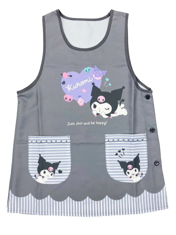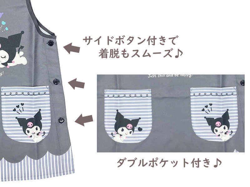 サンリオの大人気キャラ【クロミちゃん】のかわいいキャラクターエプロンが登場♪エプロン正面には小物がしまえる2つのポケットつき♪左脇がボタンになっているから脱ぎ着もしやすいです。対応サイズは(154~162㎝)なので高学年のお子様もしくは、保育園や幼稚園の先生など大人方へのプレゼントにも喜ばれそうです♪