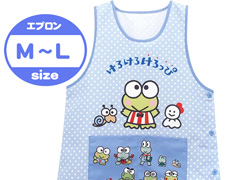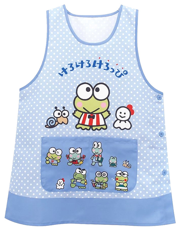 【けろけろけろっぴと仲間たち】のかわいいキャラクターエプロンが登場♪エプロン正面には小物がしまえる2つのポケットつき♪左脇がボタンになっているから脱ぎ着もしやすいです。対応サイズは(154~162㎝)なので高学年のお子様もしくは、保育園や幼稚園の先生など大人方へのプレゼントにも喜ばれそうです♪