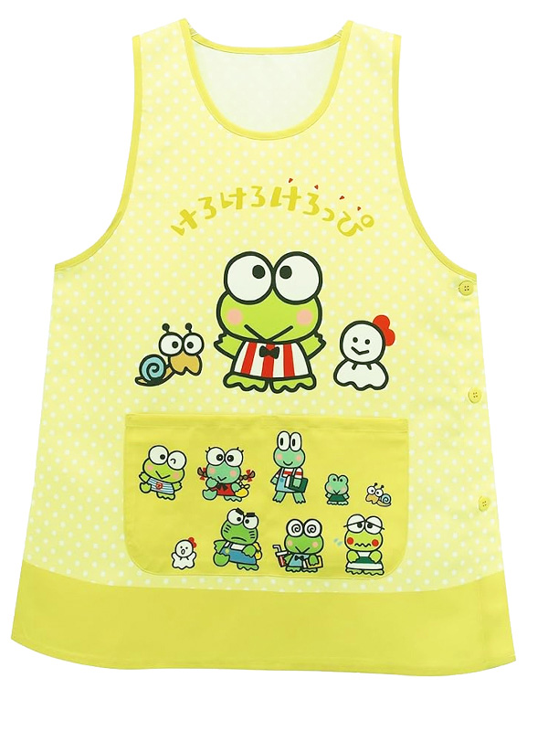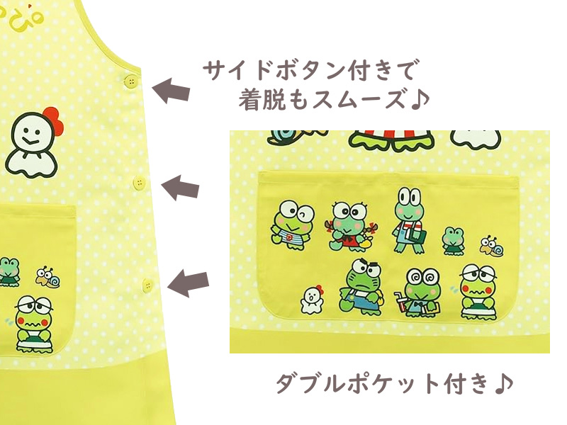 【けろけろけろっぴと仲間たち】のかわいいキャラクターエプロンが登場♪エプロン正面には小物がしまえる2つのポケットつき♪左脇がボタンになっているから脱ぎ着もしやすいです。対応サイズは(154~162㎝)なので高学年のお子様もしくは、保育園や幼稚園の先生など大人方へのプレゼントにも喜ばれそうです♪