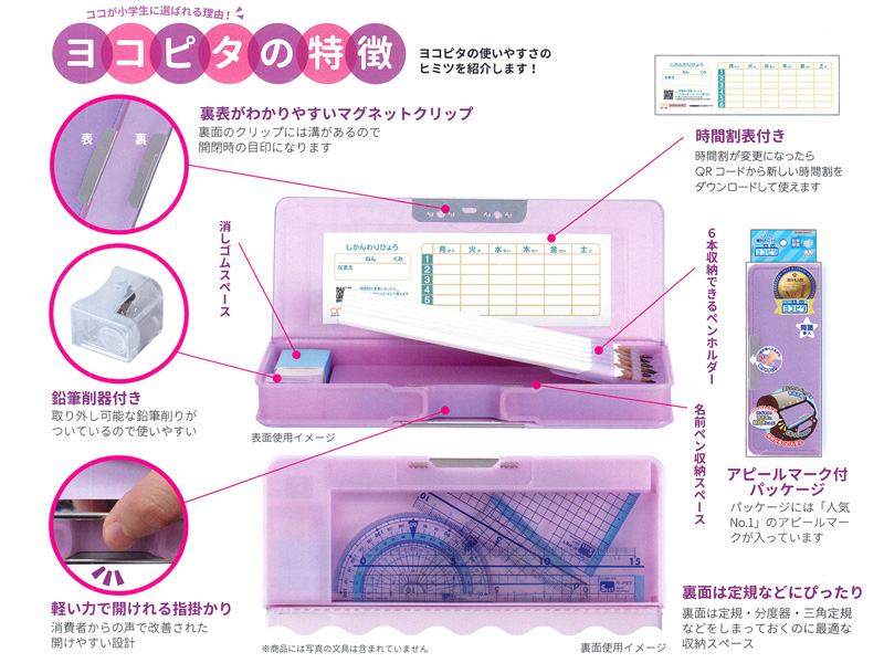 荷物が多い日にも安心の小学生にやさしい筆入れ「ヨコピタ」が登場!コンパクトだからランドセルの空いたスペースを有効活用できます!従来のはこ型ふでいれよりも約25%サイズダウンして子どもの小さい手にも持ちやすい大きさになりました!コンパクトですが、収納力は抜群。両面開きの筆箱には…鉛筆6本、ケシゴム、油性名前ペン、15cm定規、分度器、三角定規など文房具がたっぷり入ります
