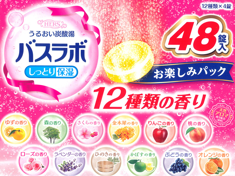 毎日のお風呂が楽しくなる薬用発泡入浴剤『バスラボ/しっとり保湿お楽しみパック』が登場♪こちらは48錠入のアソートパック。12種の人気の香りが楽しめます。スキンケアタイプの炭酸ガスの薬用入浴剤で、お湯に入れるとなめらかな泡が湯面にただよい、すべすべな肌ざわりに。ヒアルロン酸(保湿成分)配合。炭酸ガスが温浴効果を高め血行を促進し、疲労回復や肩こり・腰痛・冷え症に効果があります。
