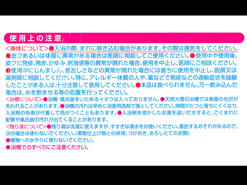 - 【効能】 ●疲労回復 ●冷え症 ●肩のこり ●あせも ●しっしん ●荒れ性 ●にきび ●腰痛 ●神経痛 ●痔 ●リウマチ ●しもやけ ●ひび ●あかぎれ