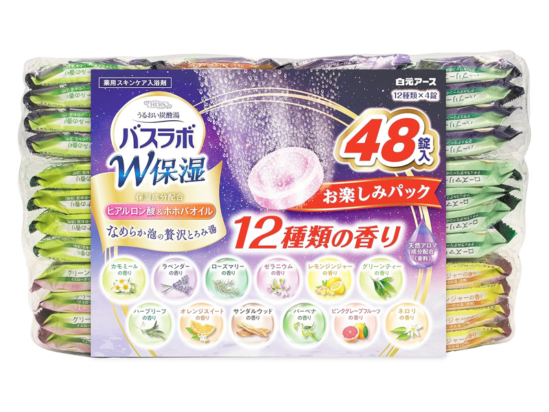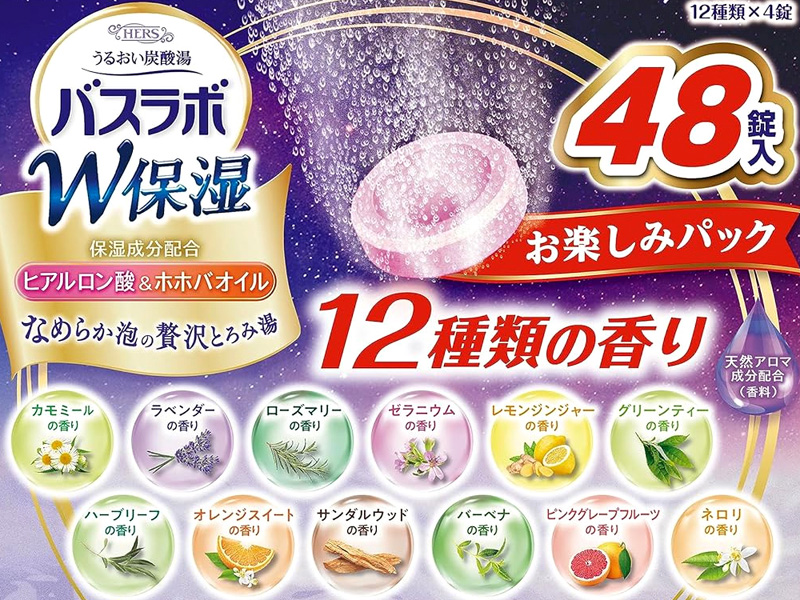 毎日のお風呂が楽しくなる薬用発泡入浴剤『バスラボ/しっとり保湿お楽しみパック』が登場♪こちらは48錠入のアソートパック。12種のうるおい炭酸湯が楽しめます。スキンケアタイプの炭酸ガスの薬用入浴剤で湯面に広がるなめらか泡のとろみ湯が素肌を包み込み贅沢なバスタイムが楽しめます。ヒアルロン酸&ホホバオイル(保湿成分)配合。炭酸ガスが温浴効果を高め血行を促進し、疲労回復や肩こり・腰痛・冷え症に効果があります。