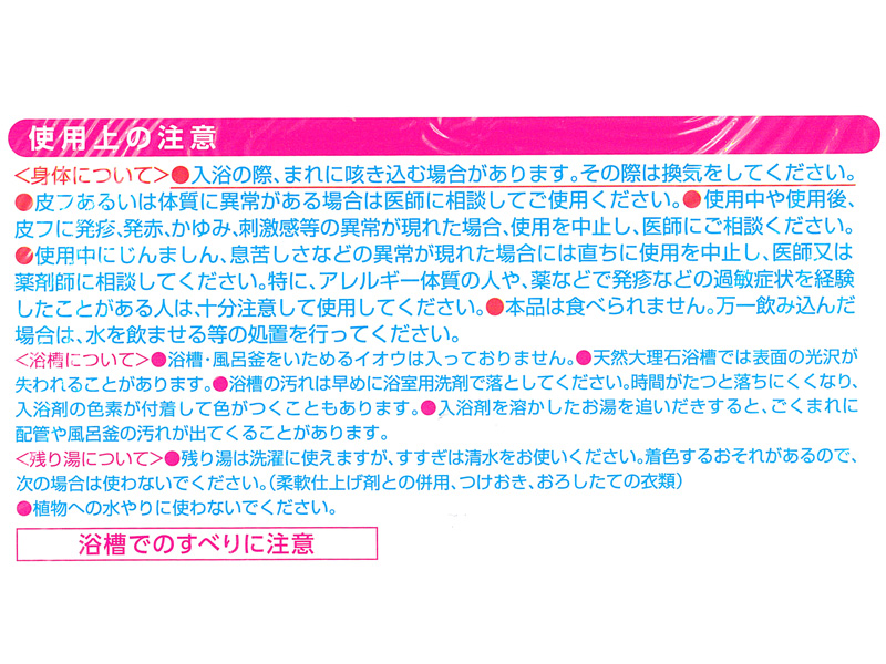 - 【効能】 ●疲労回復 ●冷え症 ●肩のこり ●あせも ●しっしん ●荒れ性 ●にきび ●腰痛 ●神経痛 ●痔 ●リウマチ ●しもやけ ●ひび ●あかぎれ
