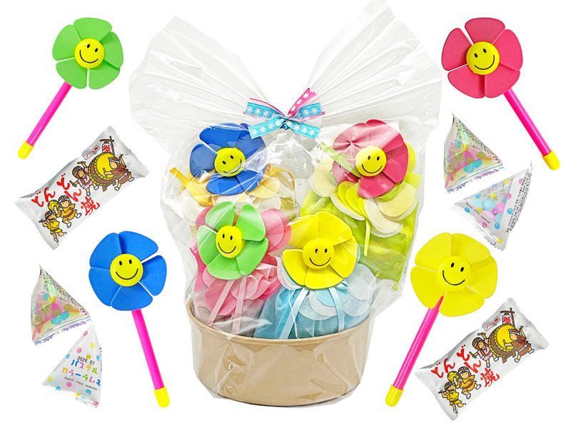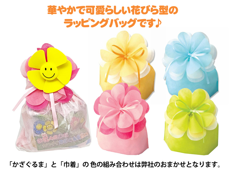 まるで鉢植えに入ったお花みたいなキュートで愛らしいオリジナルギフトが登場~♪花びらのような形をした巾着バッグの中にはそれぞれ3種類のお菓子が入っています♪また袋の外身についてる花びら型のかざぐるまはフーっと息を吹きかけるとクルクル回ります!たのしみ会・発表会などのお祝い、記念品のギフト、プレゼントなどにゼヒともご活用ください!