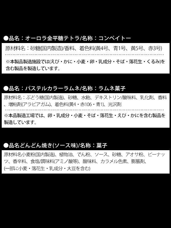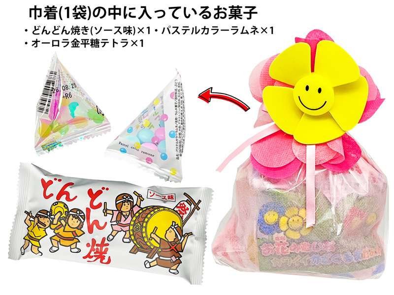 - 巾着(1袋あたり)の内容:雑貨(フラワーかざるぐま×1)/お菓子(・どんどん焼き×1・パステルカラーラムネ×1・オーロラ金平糖テトラ×1)×4袋入