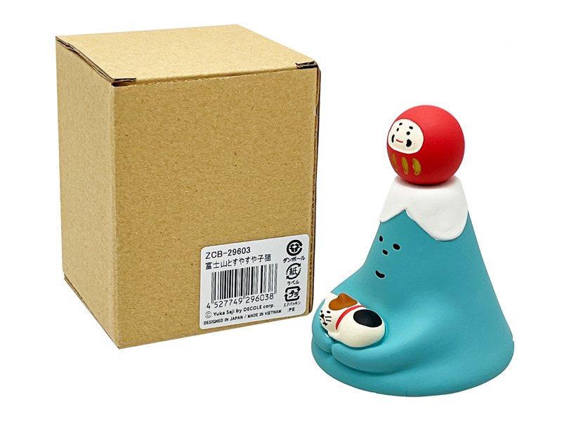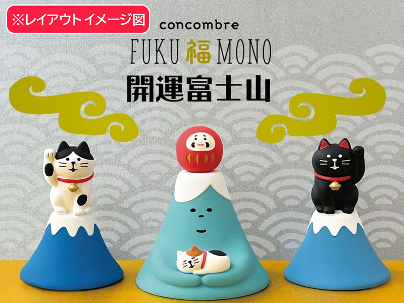 キュートな小物のコンコンブルシリーズから[開運富士山]シリーズが登場!こちらは福だるまと富士山に見守られてすやすや眠る…『富士山とすやすや子猫』の置物です。富士山の末広がりの形は発展や繁栄の象徴、幸運を呼び込むといわれ、また「不死」「無事」に通じることから健康長寿、無病息災、家内安全の祈願にも良いとされています。