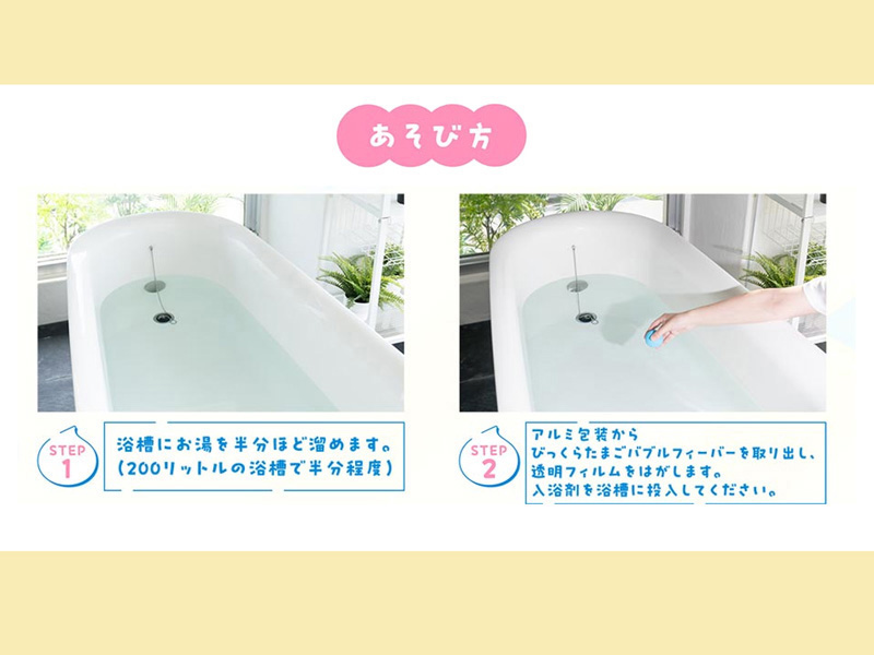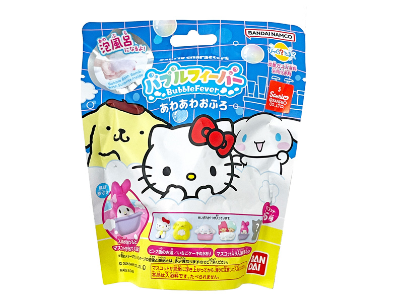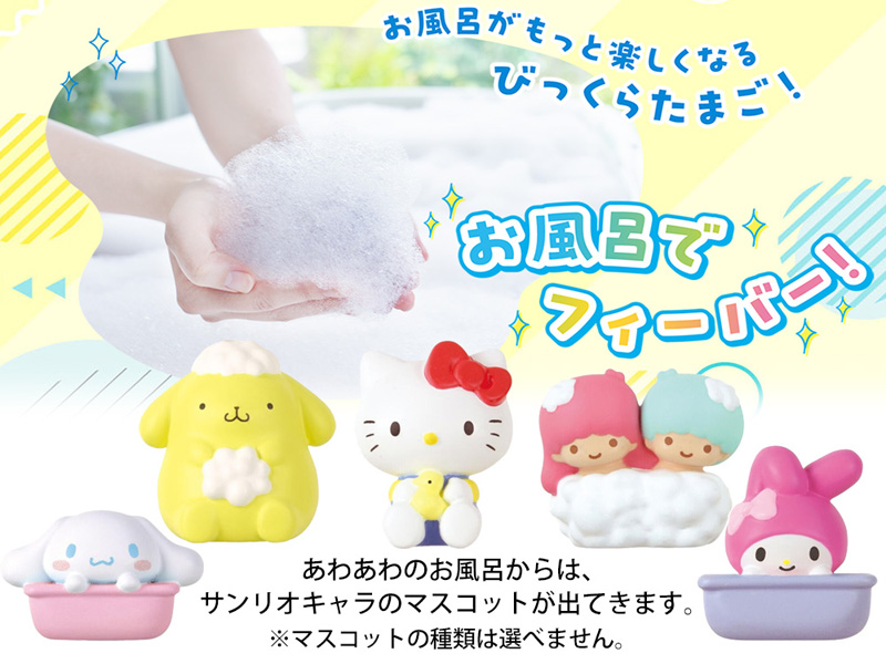 入浴料を湯船に入れて、湯面にシャワーを当てると泡風呂が出来上がる! 「びっくらたまご・バブルフィーバー」からサンリオキャラクターズが登場!あわあわのお風呂からは、泡風呂であそんでいるようなサンリオキャラクターたちのマスコットが出てきます。ラインナップは全6種!マスコットと同じようにあわあわのお風呂が楽しめる、新体験のびっくらたまごバブルフィーバーをお楽しみください!