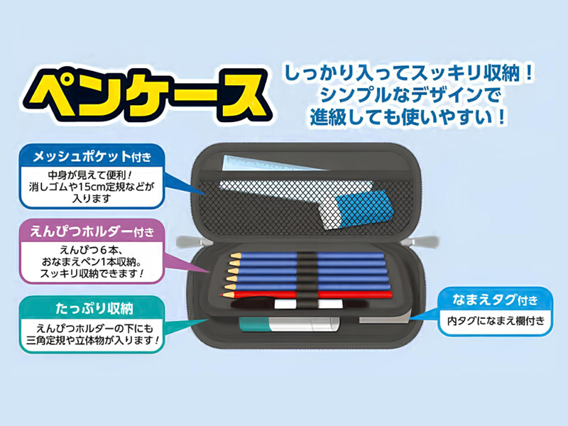- 【仕 様】メッシュポケット×1、鉛筆ホルダー付、なまえタグ付