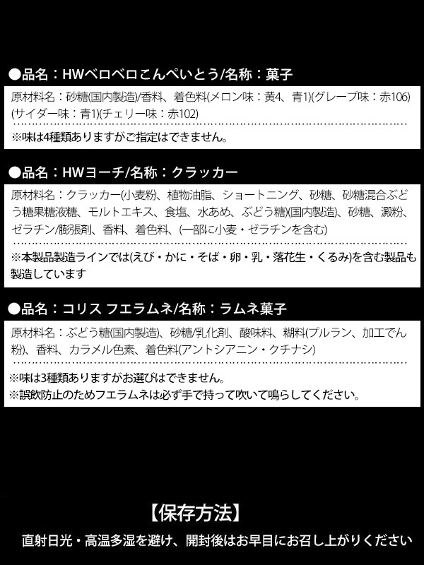 - (ギフト1個あたりの内容量)…(HWヨーチ×2・HWベロベロこんぺいとう×1・コリスのフエラムネ×1)